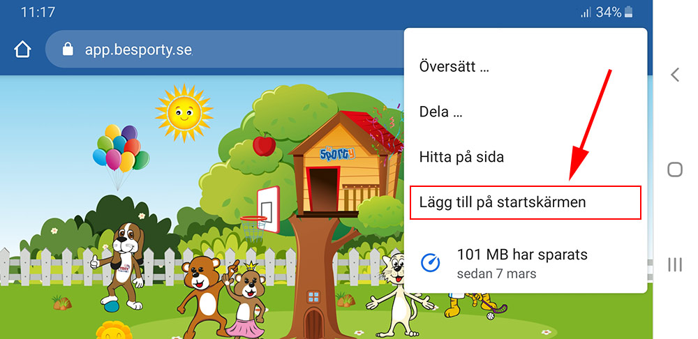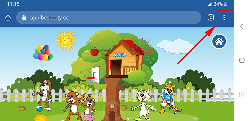 De flesta webbläsare på Androidenheter kommer automatiskt fråga dig om du vill lägga till sidan/appen på din hemskärm. Om du inte får denna fråga kan du manuellt ändå installera appen. Surfa till: app.besporty.se och följ instruktionerna som visas nedan.