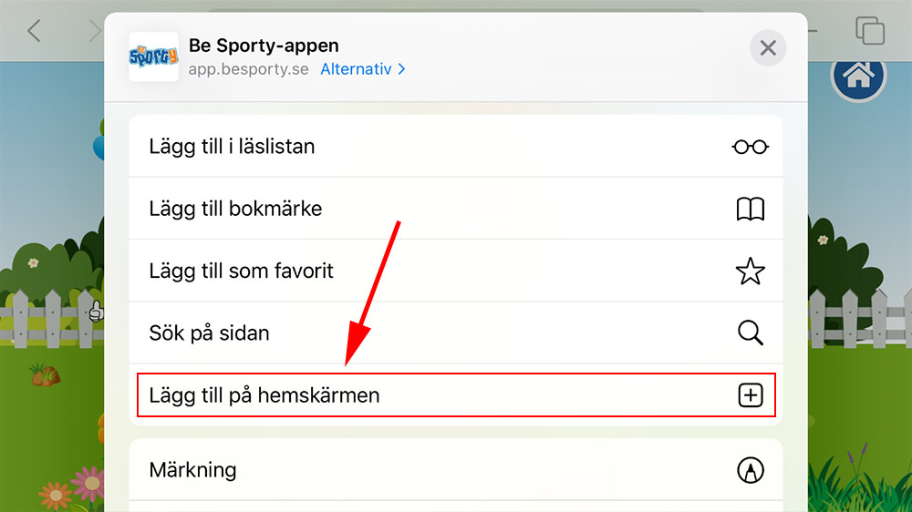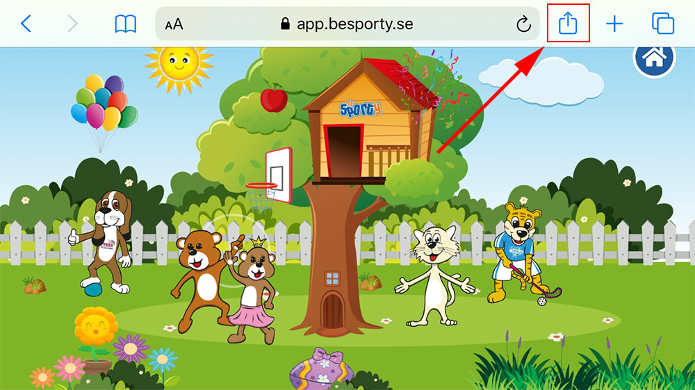 För iOS (iPhone/iPad) behöver du aktivt själv välja att installera/lägga till appen på din hemskärm. Surfa till: app.besporty.se och följ instruktionerna som visas nedan.